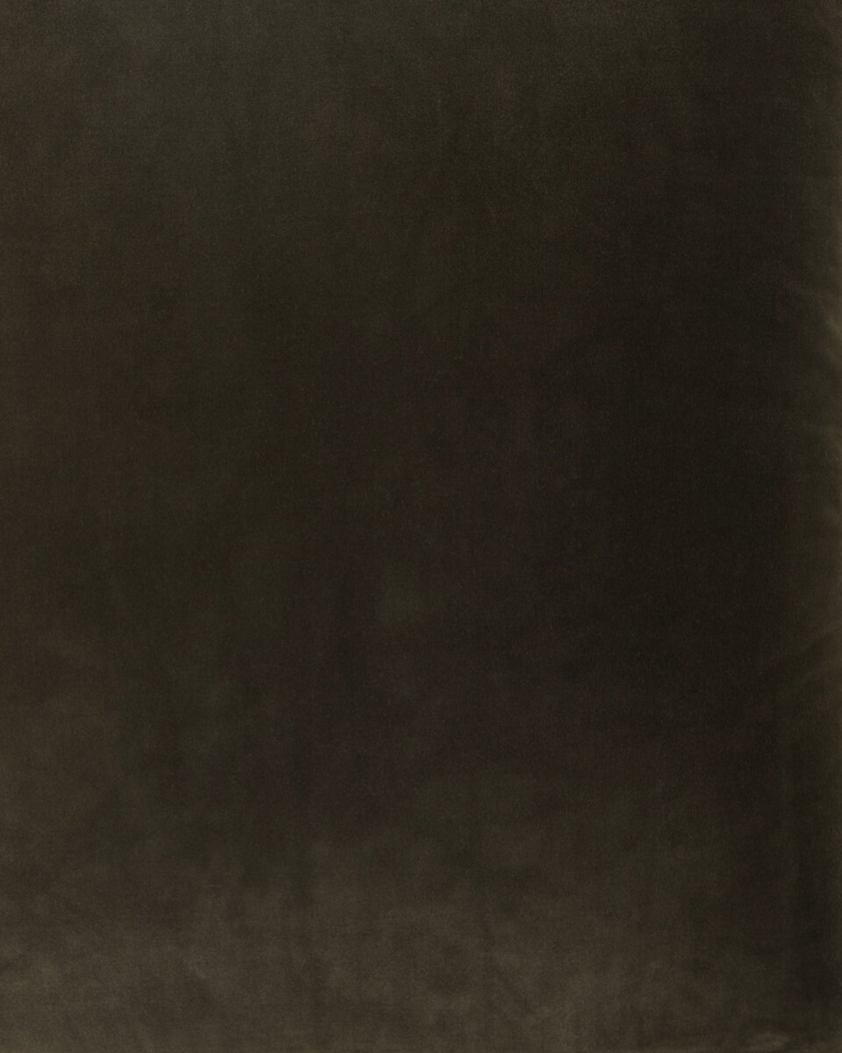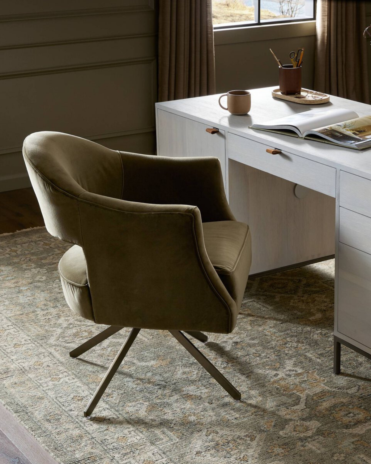 A Seventies form gets a modern refresh. Velvety olive upholstery shapes comfortable curves, lightened up with a posterior cutout. Polished brass legs taper at a slant for retro effect. A 360-degree swivel base brings ease to the modern office.