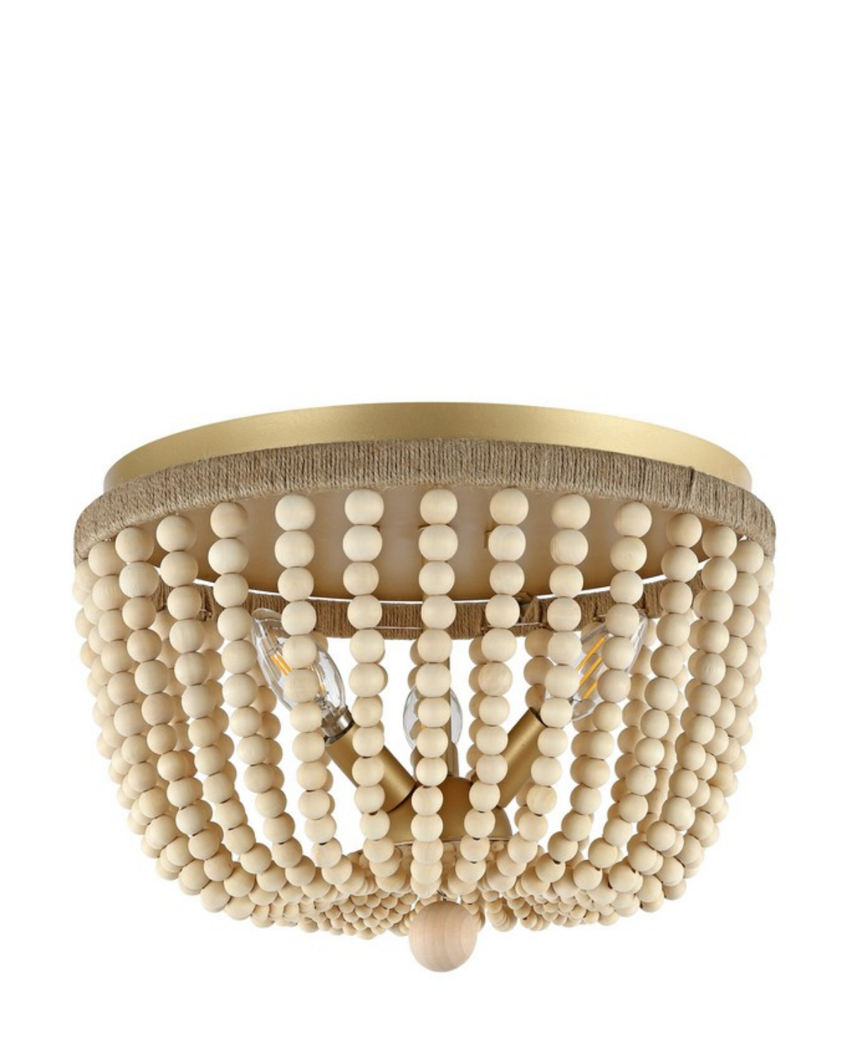 The Alodia Flush Mount brings rustic elegance and warmth to any space. Draped with strands of wooden beads and rope detailing, it creates a stunning canopy that catches the eye. A polished gold frame adds a touch of sophistication, beautifully balancing the earthy textures. Designed with three bulbs, the Alodia casts a soft, inviting glow that enhances living rooms, bedrooms, or entryways with natural charm and timeless style.