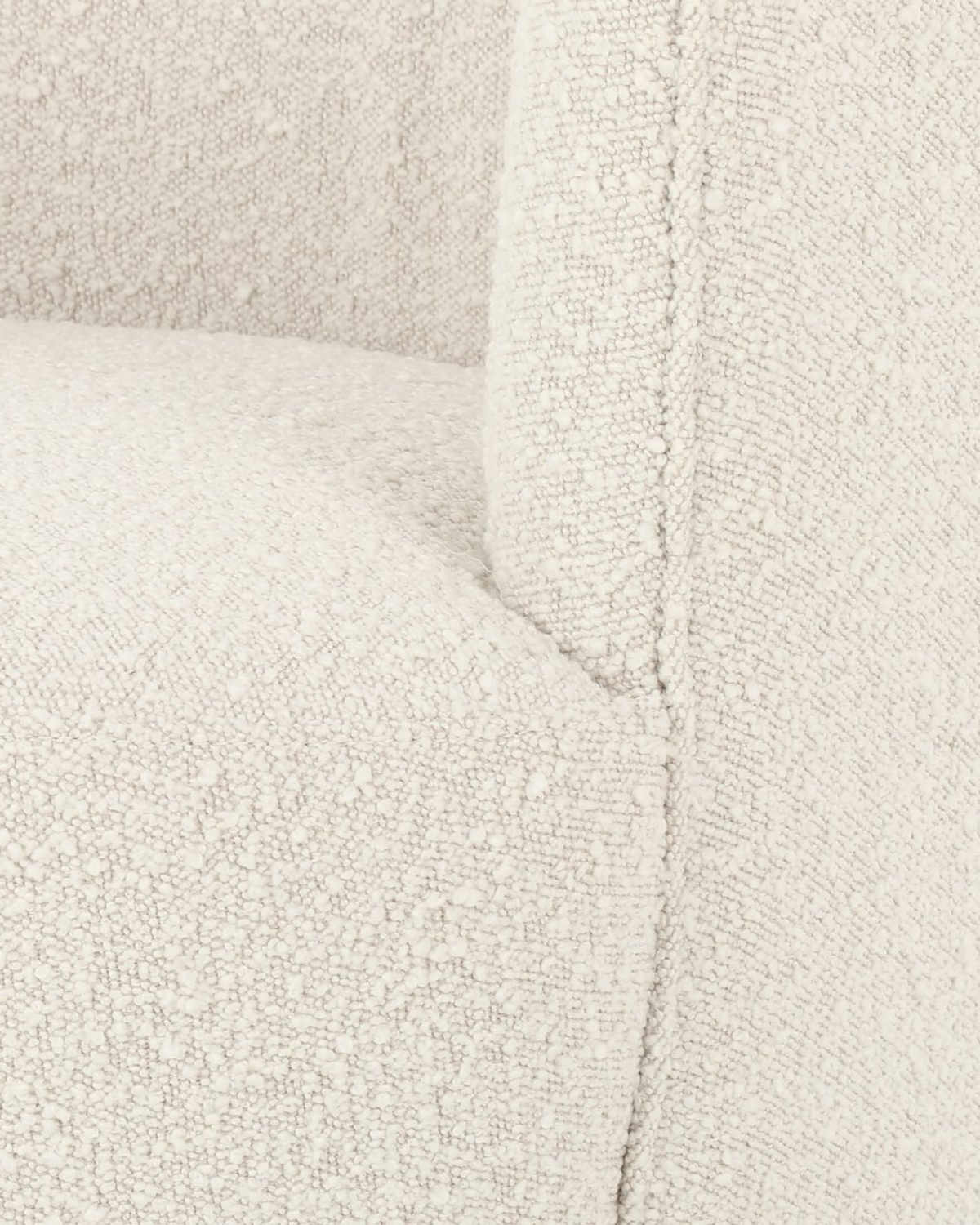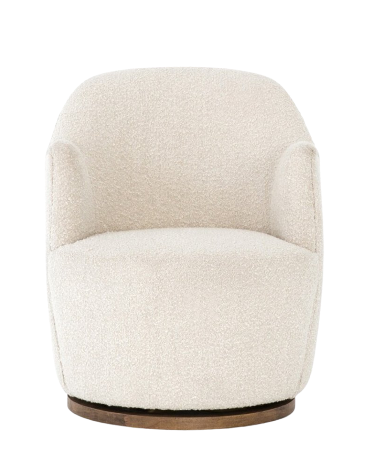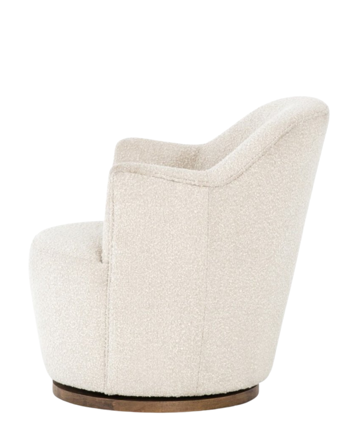 Intriguing while inviting. Drum-style seating is upholstered in a soothing and textural off-white bouclé. A 360-degree swivel base of natural parawood places a fresh spin on a feminine form.