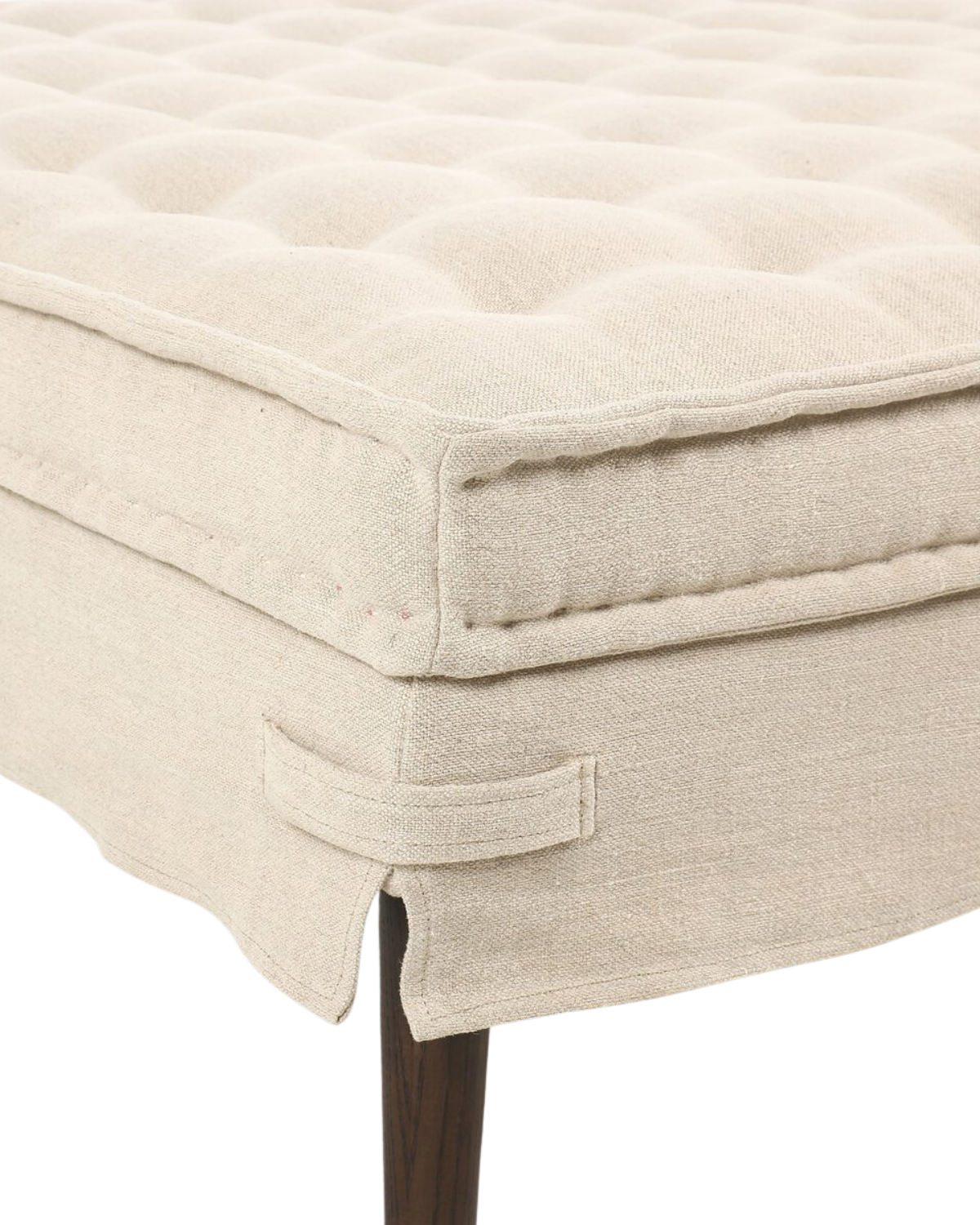 This European vintage-inspired ottoman brings quiet luxury to any living room. With a skirted French mattress style cushion, subtle tufting, and S-spring suspension, it offers a comfortable, oversized piece that can function as a coffee table or additional seating.
