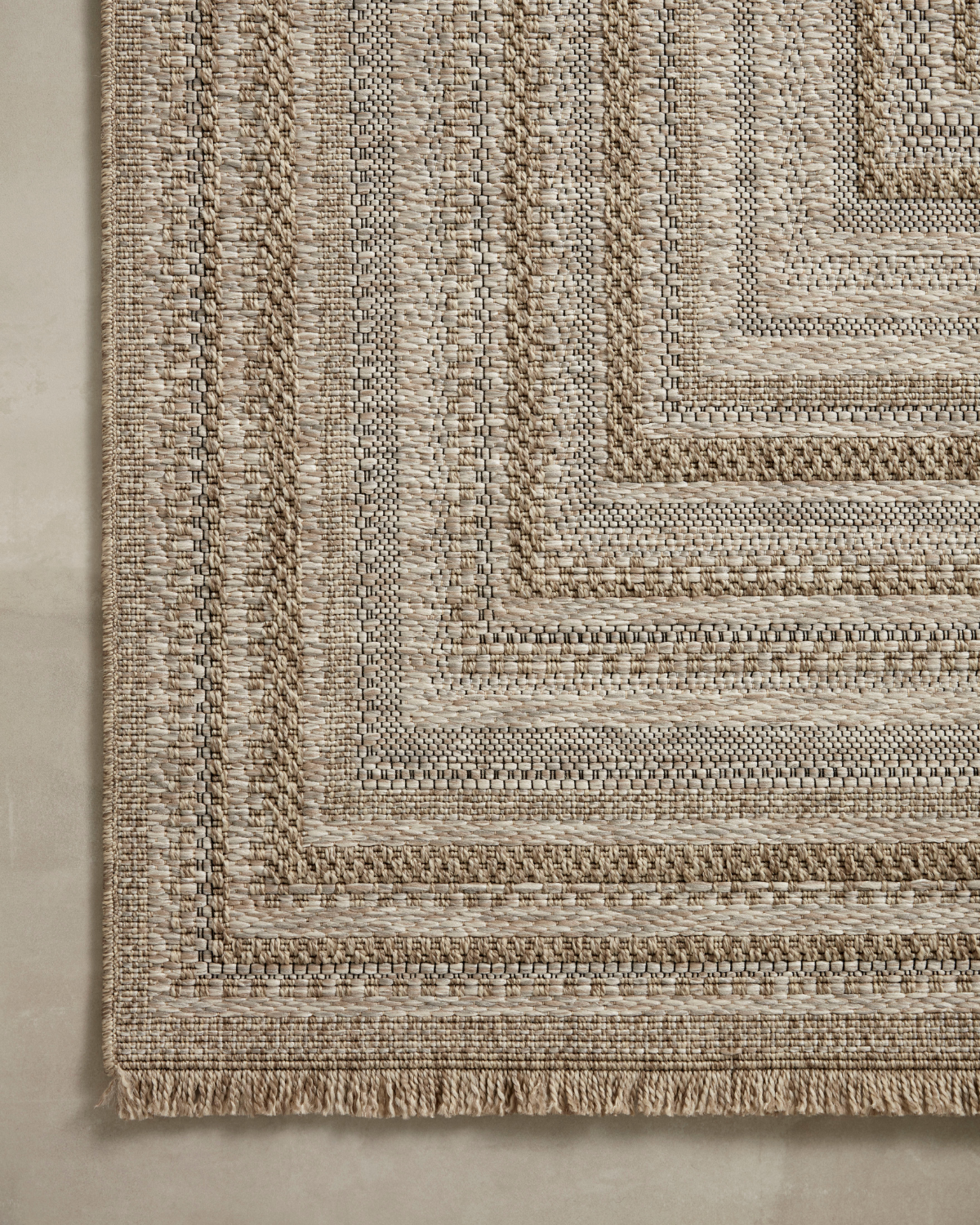 Made for sunny days ahead, the Dawn Collection is an indoor/outdoor rug that looks like a woven sisal rug but is power-loomed of 100% polypropylene, which makes it water- and mildew-resistant (so it's ready for rainy days ahead, too). Available in modern graphic patterns in tonal beige neutrals, Dawn has a short edge fringe that adds a playful and elevated feel to a rug that can handle a lot of foot (or paw) traffic whether outside on a patio or in a busy mudroom. Rinse off with a hose when needed.