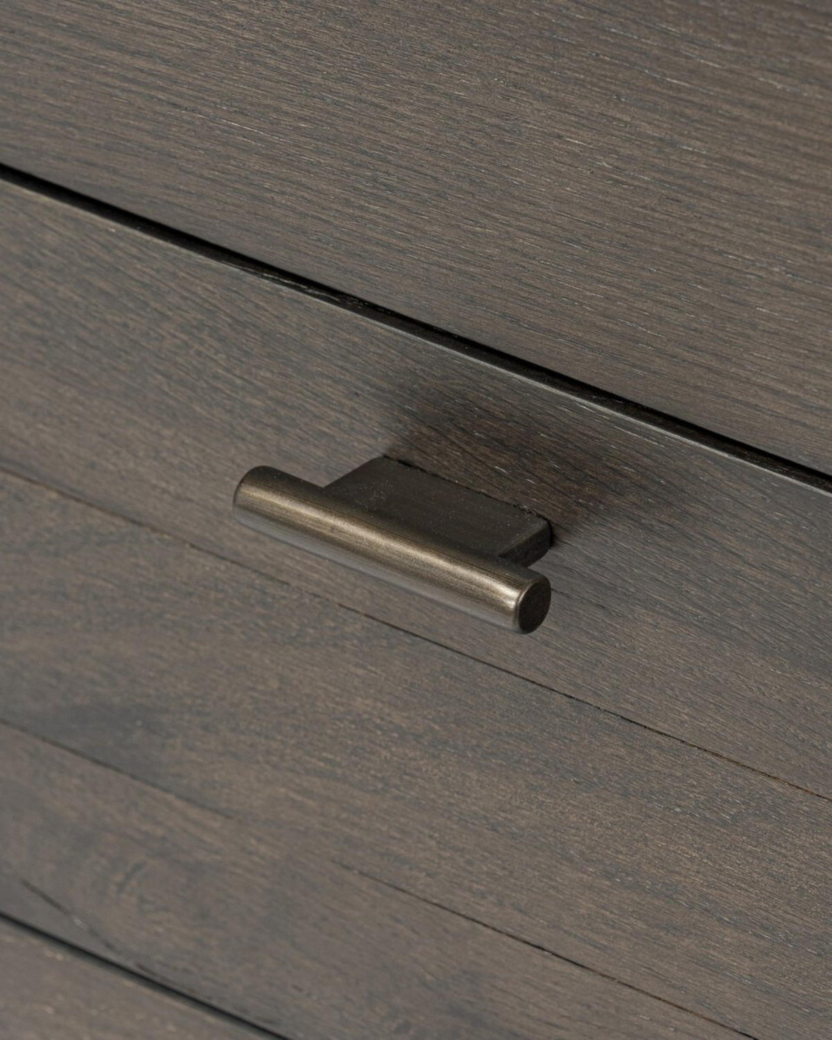 The traditional spindle structure brought to modern speed. Made from smoked black oak, six drawers bring generous storage space to the bedroom. Simple cylindrical hardware is finished in an aged bronze.