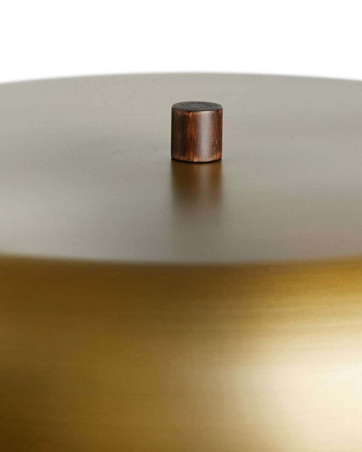 A stylish nod to midcentury mushroom lamps, this beautifully scaled wooden lamp features a gleaming metal shade finished in aged brass. It's topped with a small wood finial to complete the look.