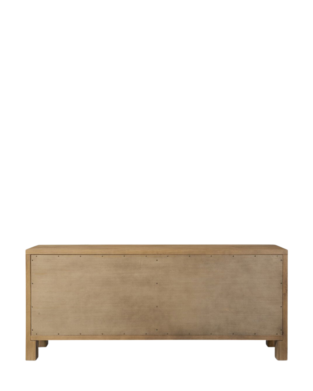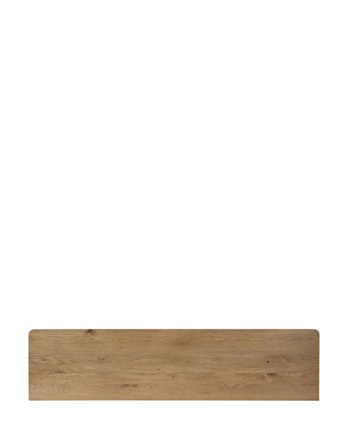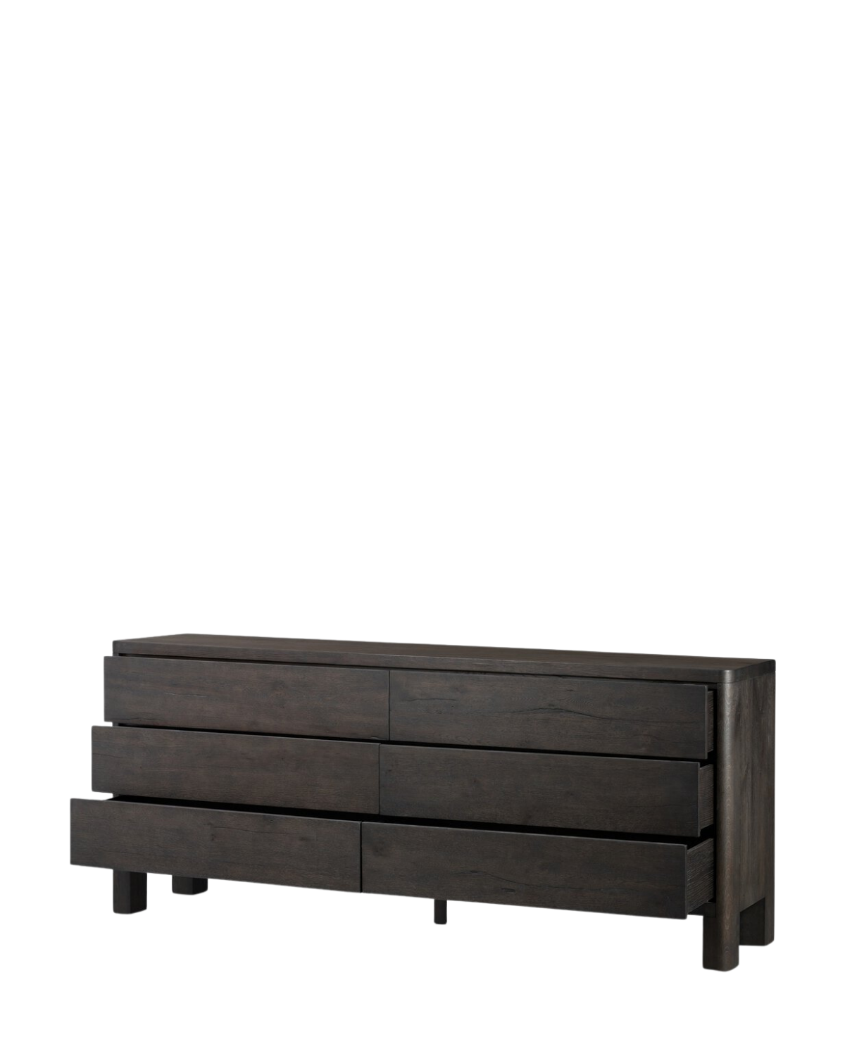 A thick plank of worn oak tops a wide dresser, meeting modern lines with a warm, natural feel. Six drawer fronts feature a push-latch mechanism for a seamless look.