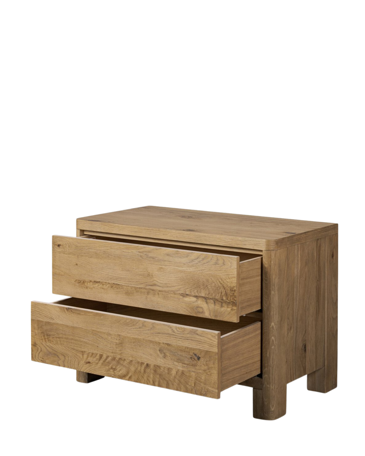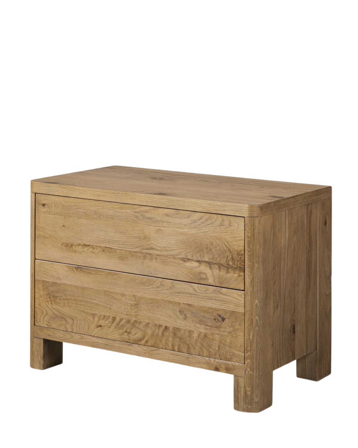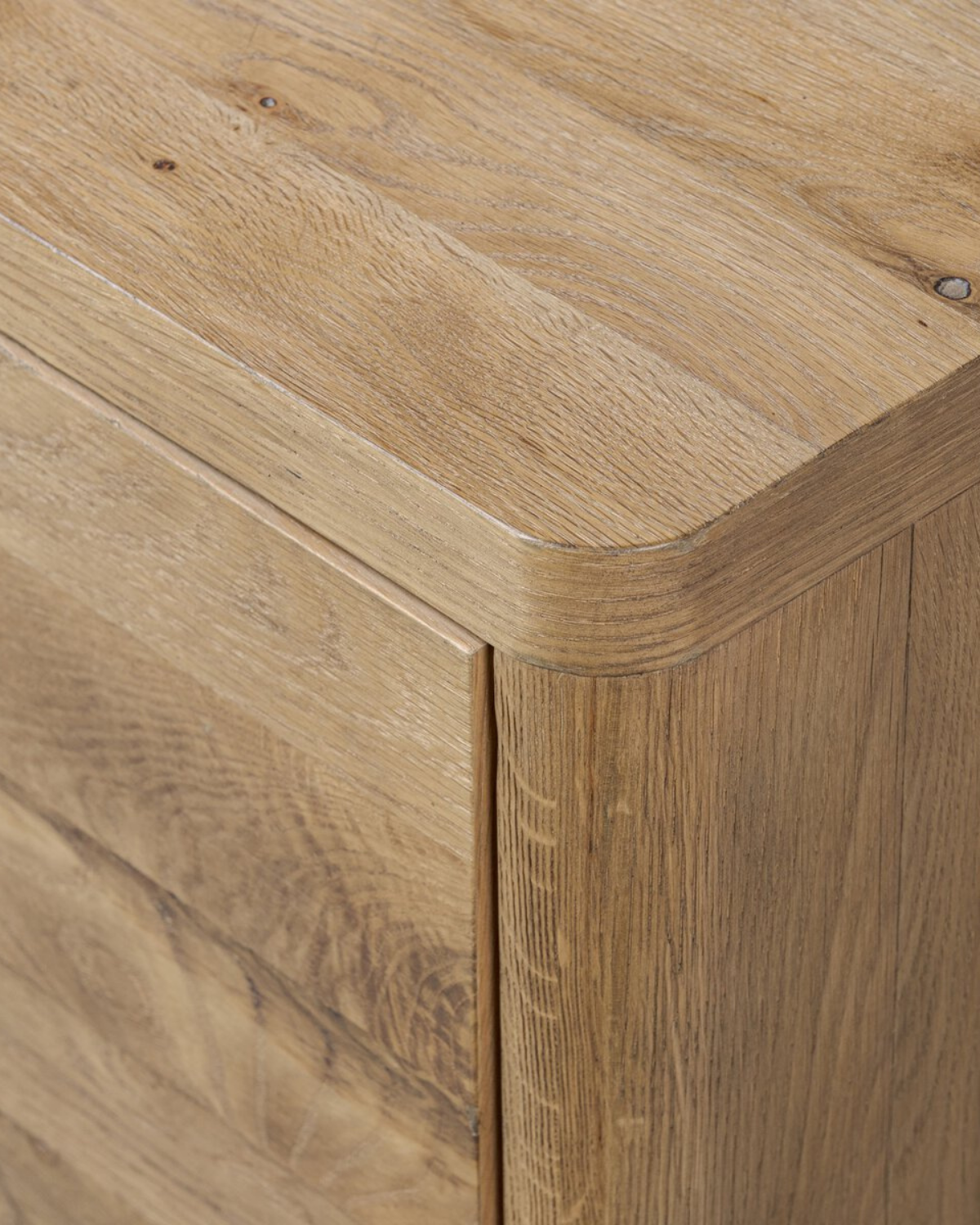 A thick plank of worn oak tops a wide dresser, meeting modern lines with a warm, natural feel. Dual drawer fronts feature a push-latch mechanism, bringing a seamless look to bedside storage.
