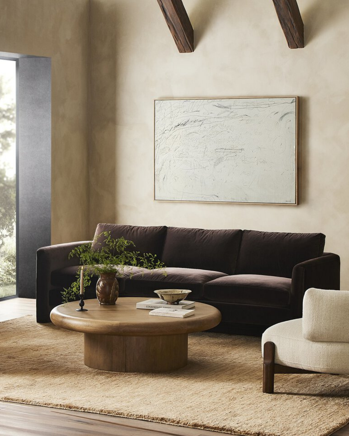 Turn up the volume. A pedestal-style base of solid burnished parawood supports a large, rounded tabletop with bullnose edging, for style and softness alike.